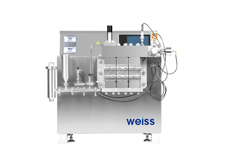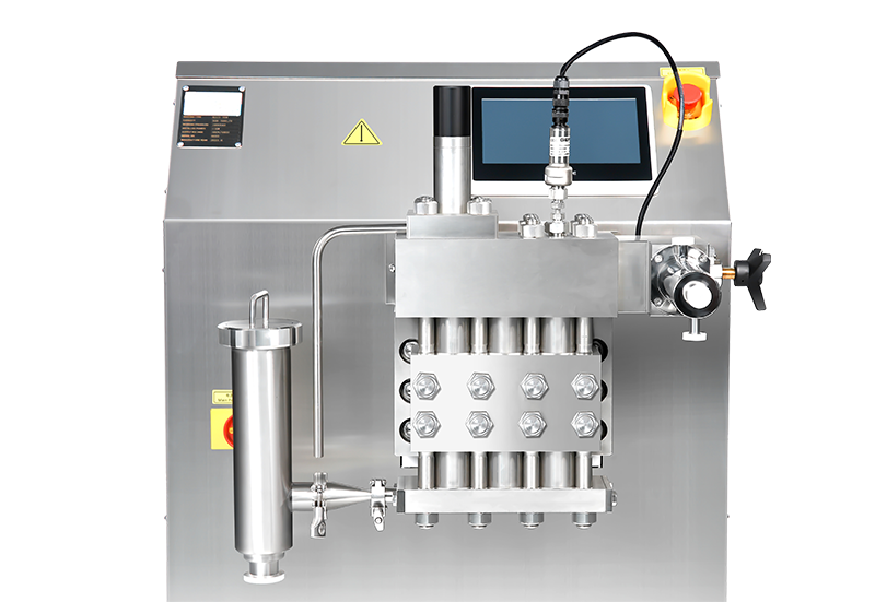 物料在柱塞的往复运动的作用下,输送到一个大小可调的阀组中,受到极强的压缩作用,在通过限流狭缝时,以极快的速度撞击在均质阀,产生空穴效应,撞击效应和剪切效应,使团聚的物料均匀分散。