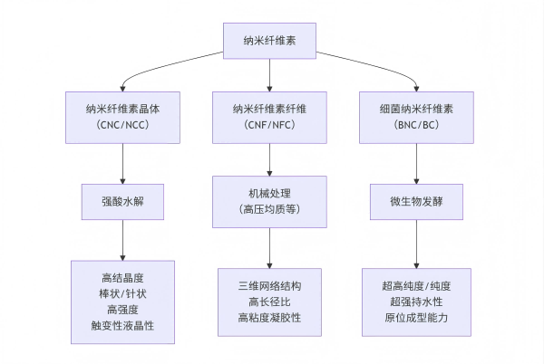 纳米纤维素根据其纤维素来源、 加工条件、尺寸、功能和制备方法可分为3大类:纤维素纳米晶体(CNC/NCC)、纳米纤维素纤维(CNF/NFC)和细菌纤维素(BNC/BC)。
